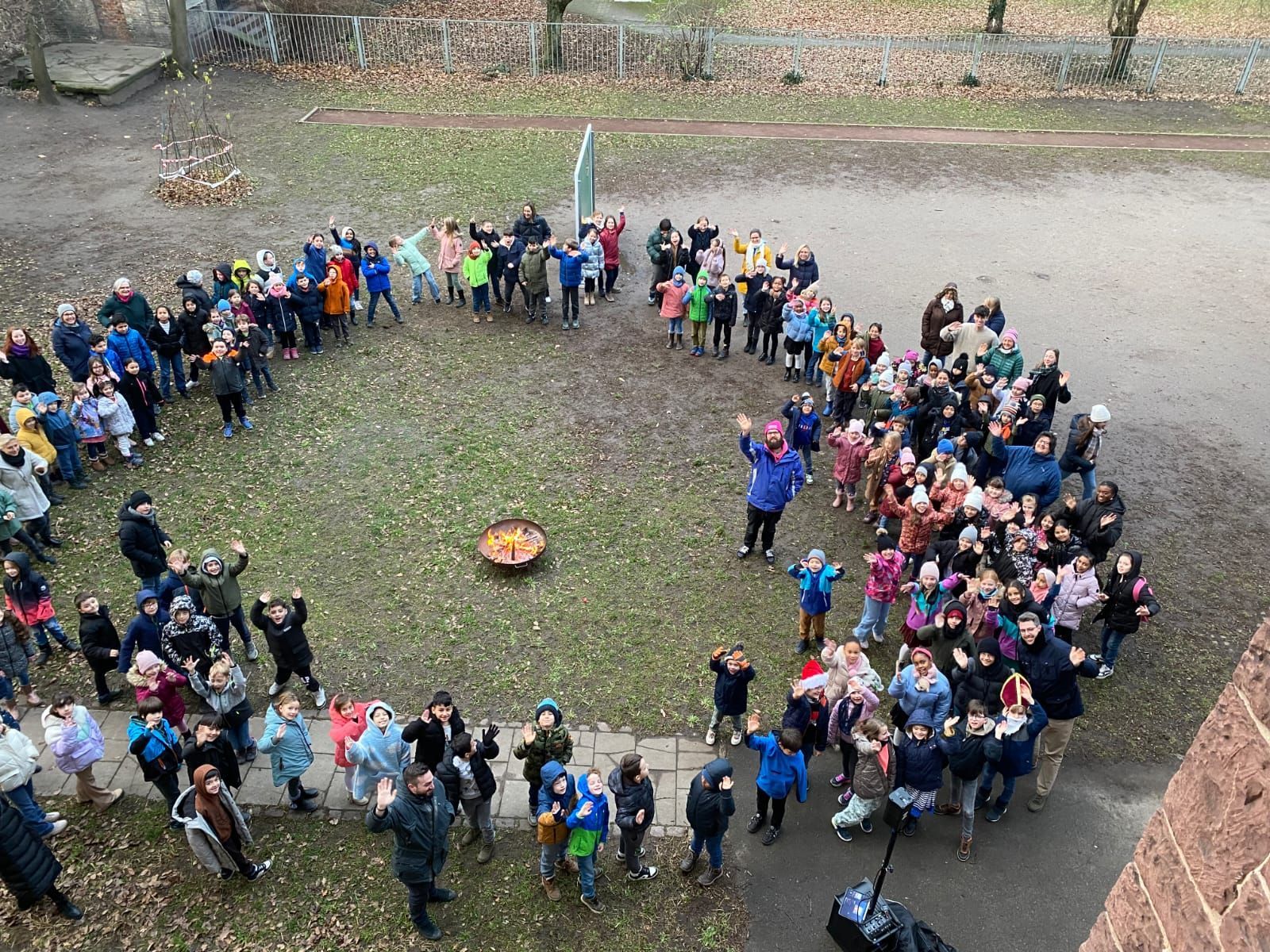Zum Abschluss vor den Weihnachtsferien treffen sich vormittags alle hinter der Schule rund um eine Feuerschale und singen gemeinsam.