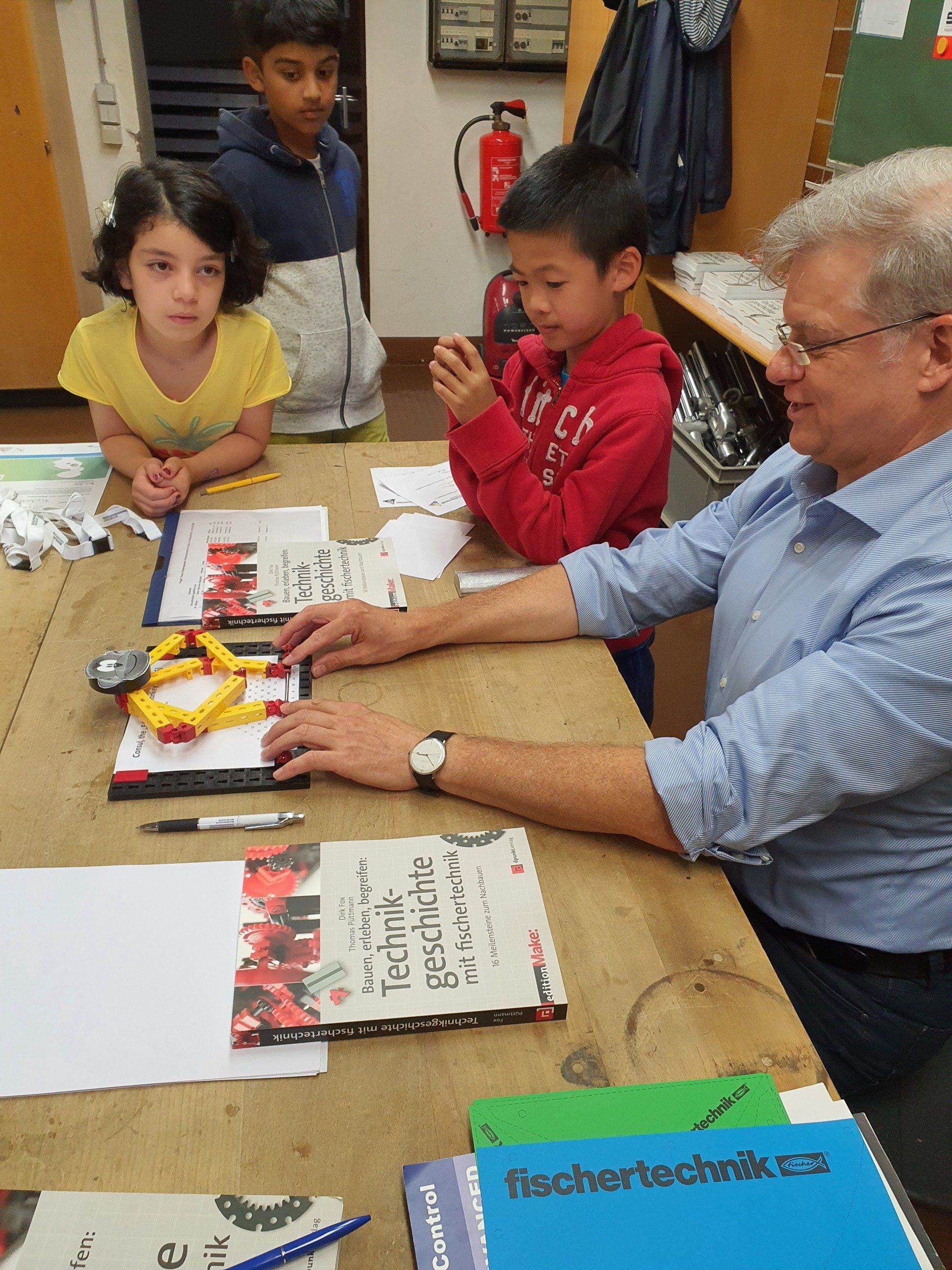 Harald Denecken, Erster Bürgermeister a. D. und Vorstandsvorsitzender der Schülerakademie ließ es sich als ehemaliger Lehrer der Schillerschule nicht nehmen, den Kindern persönlich zu gratulieren und in einen sehr unterhaltsamen und spannenden Austausch mit den jungen Fischertechnikern zu treten. Er lobte das Engagement der Kursleiter Fr. Werner (Schülerakademie KA) und Hr. Veit (Schillerschule KA) und die angenehme Arbeitsatmosphäre, die man mit einem gut ausgestatteten Kursraum für die Kinder geschaffen hat.