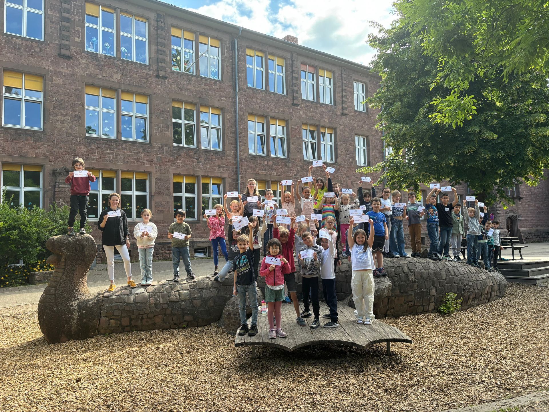 Nach der Wahl versammelten sich die Kinder auf dem Schillerdrachen im Pausenhof für eine gemeinsame Fotoaktion.