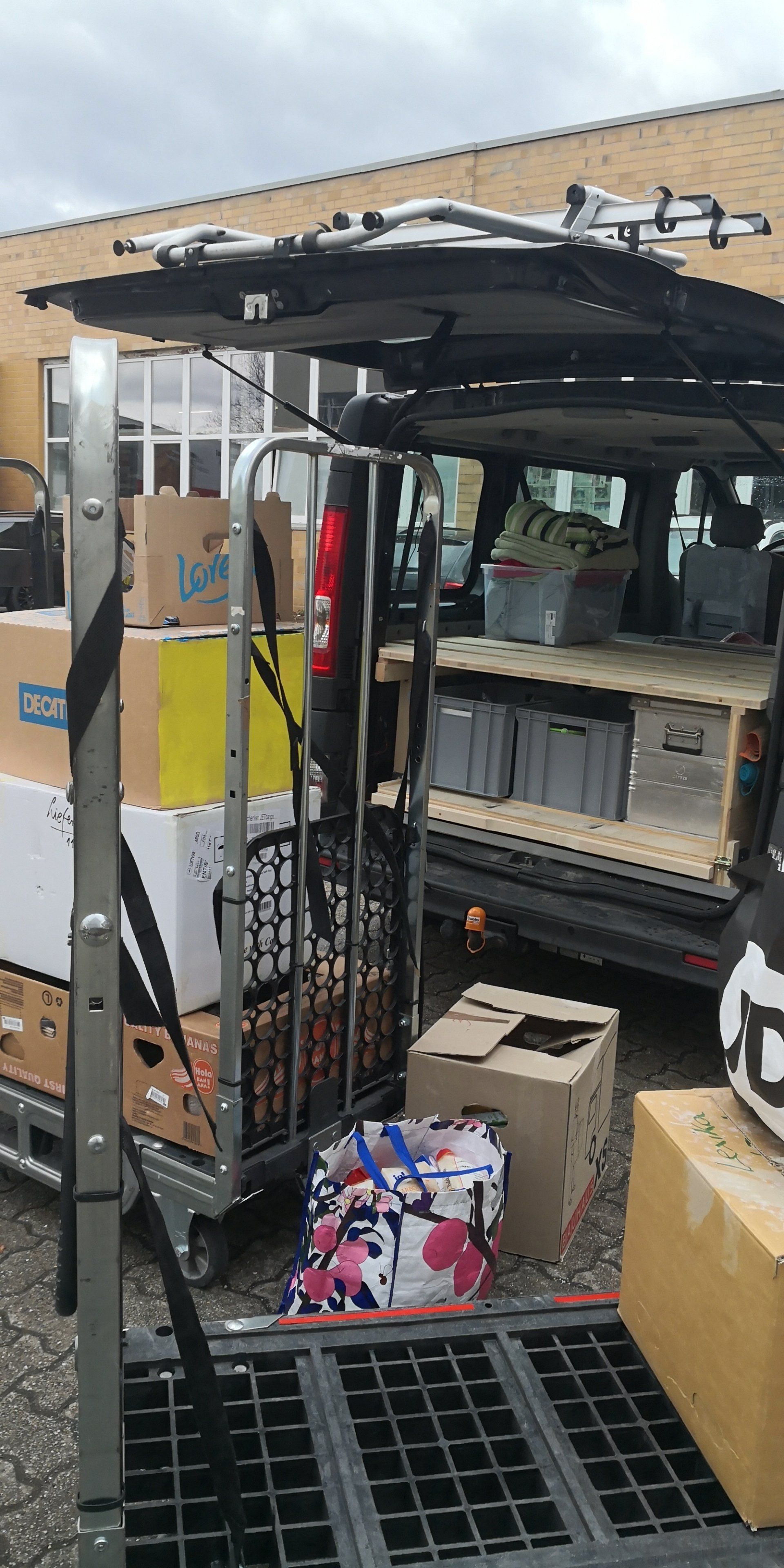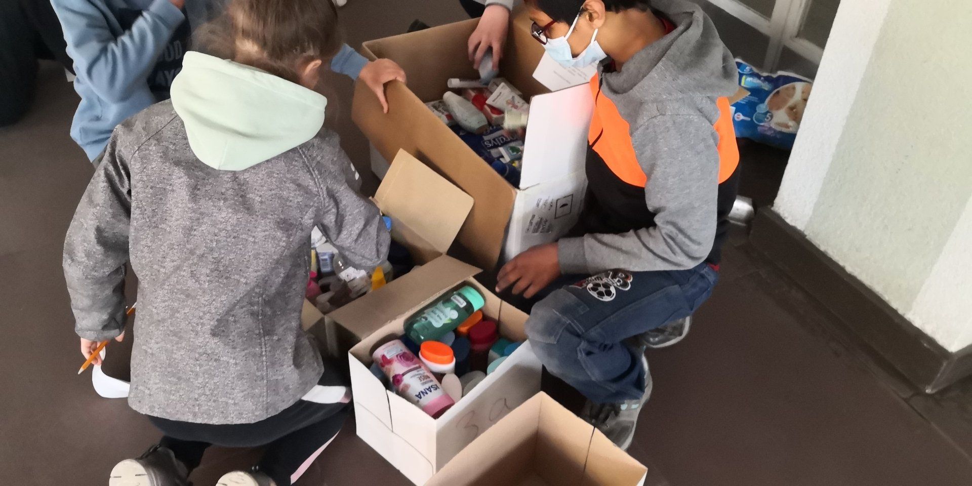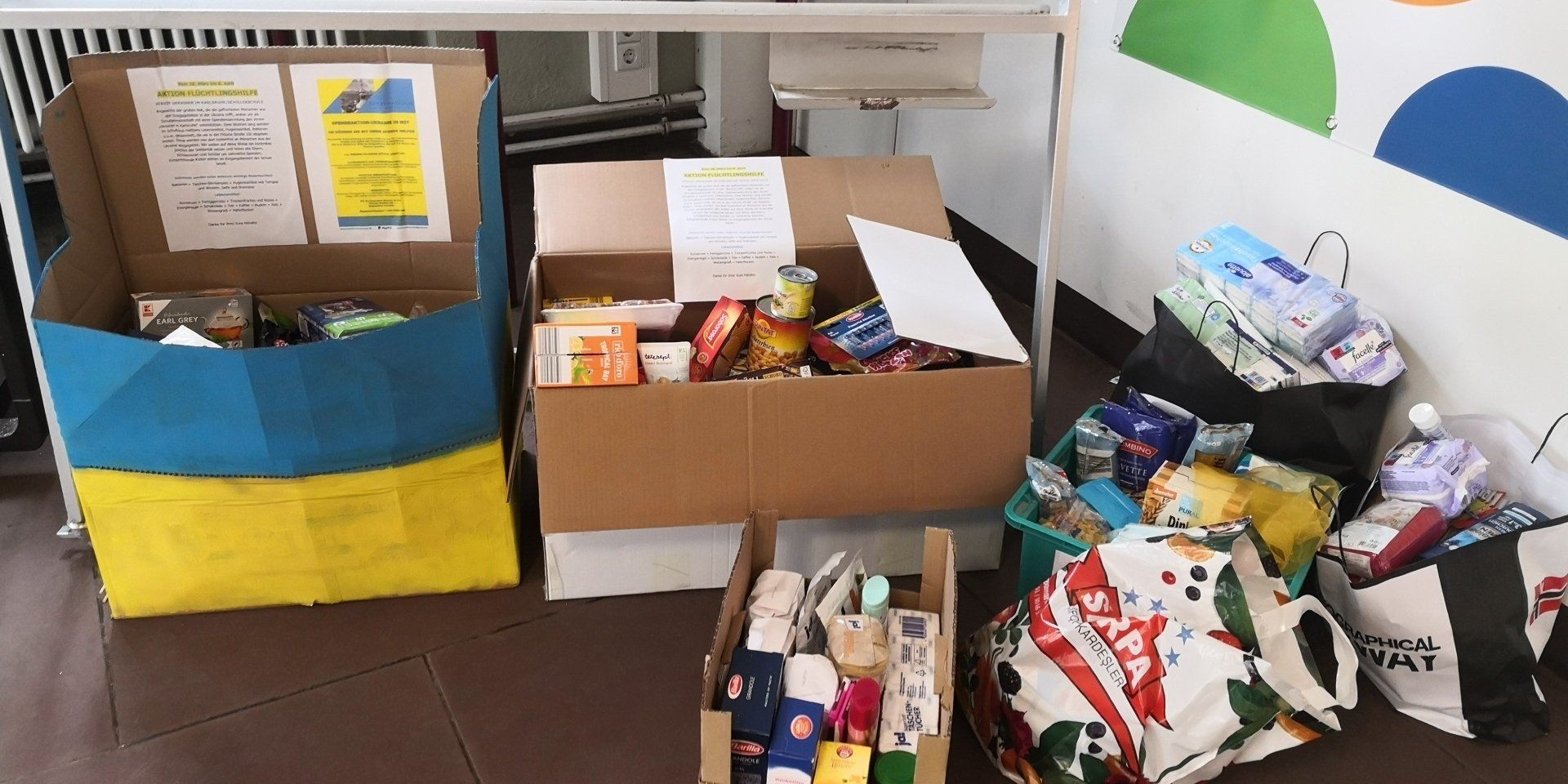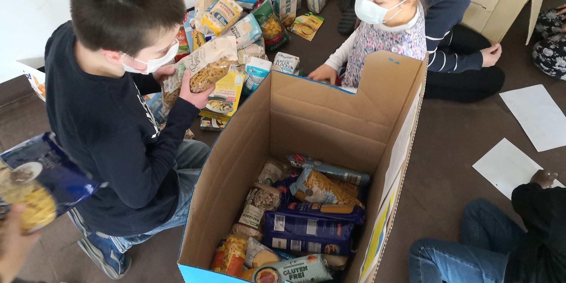 Nudeln, Reis, Haferflocken, u.s.w. in die eine Kiste, Duschgel, Tempos und Windeln in die andere Kiste.